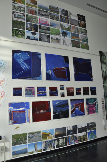 作品資料として、これまで撮りためてきた写真と木版画正方形のシリーズ「mirror」を壁一杯に並べました。