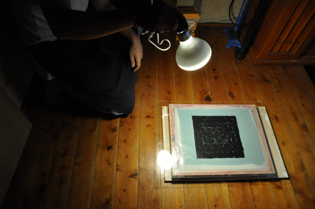 懐かしい…、この箱型露光機を作るまでは、太陽光で露光していた。20分~30分くらいかかるので、限られた時間の中で作業しなければならない事と、授業のほとんどを露光時間にかかるのはとても現実的ではなかったので、自作に踏み切った。