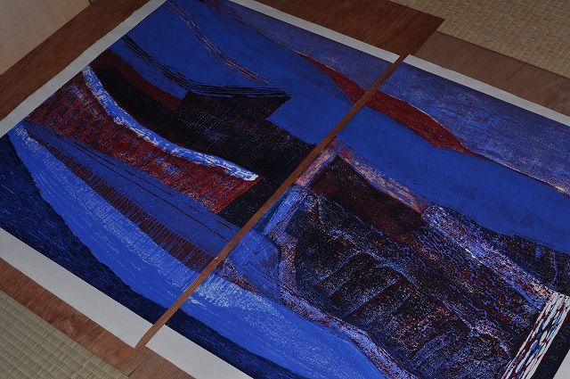僕が今使ってる紙は三裁(60×90㌢)までが摺れる紙なので、大きい作品はどうしているかというと紙と紙を繋いで作っている。